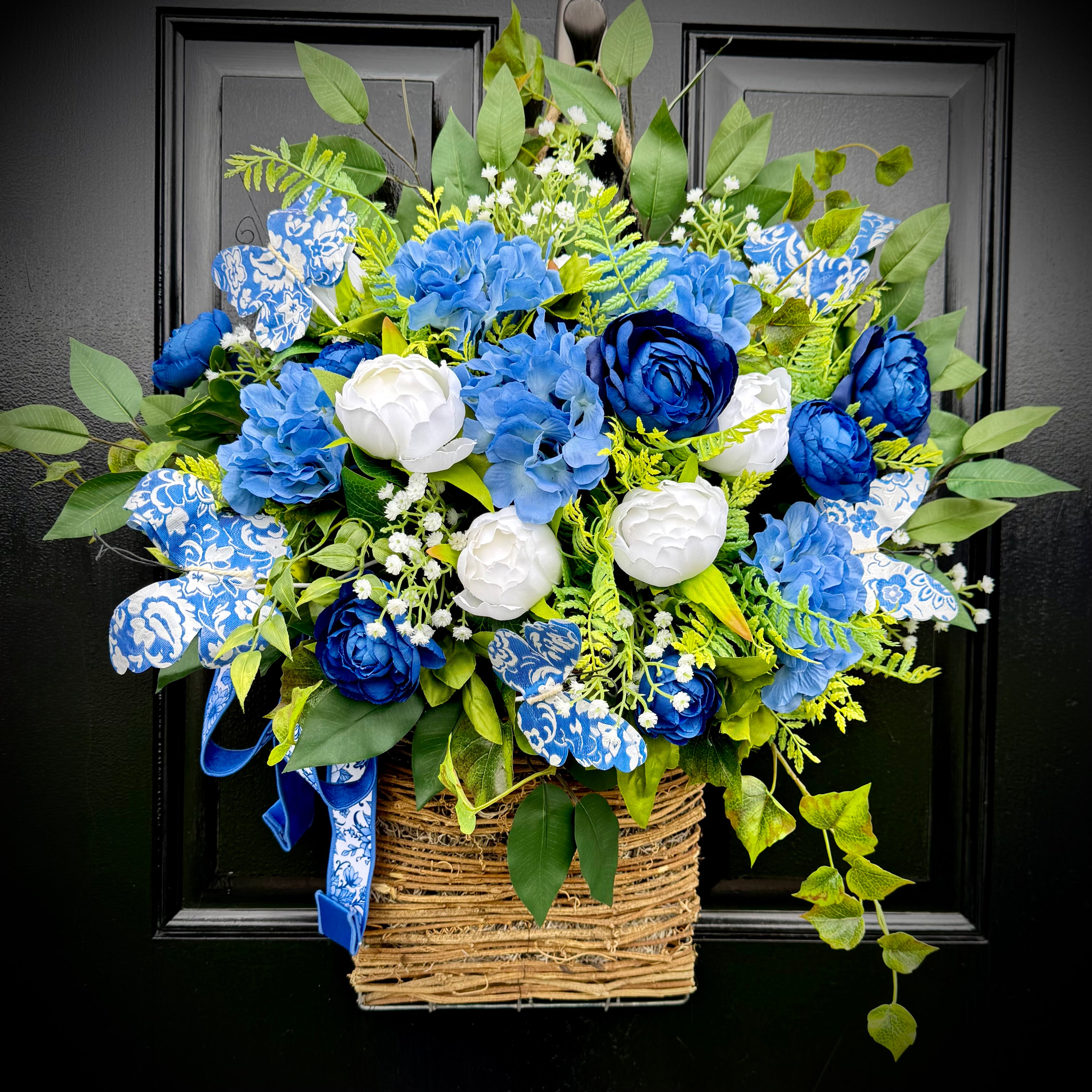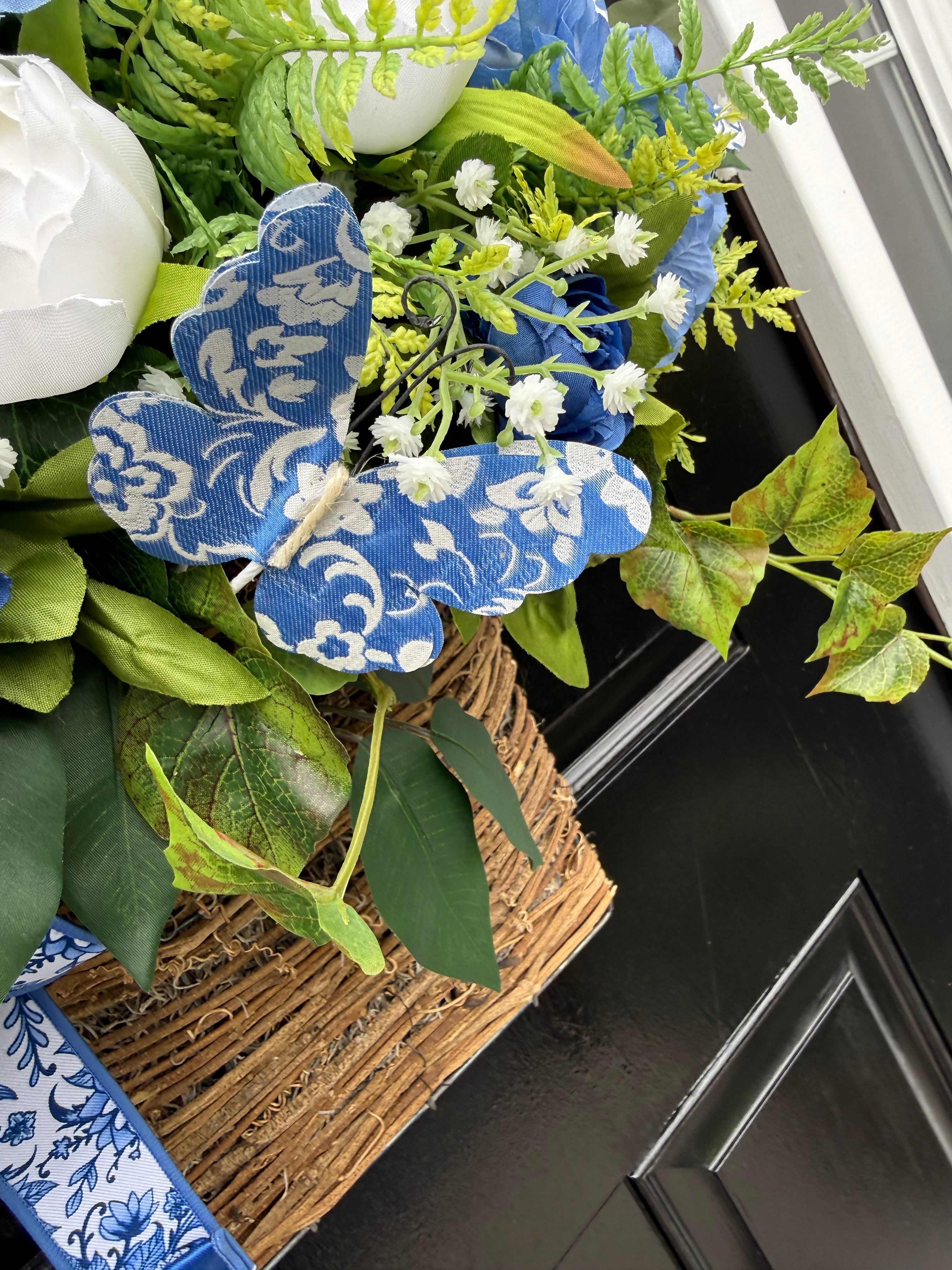 Chinoiserie Hydrangea & Peony w Butterflies Basket for Spring and Summer
