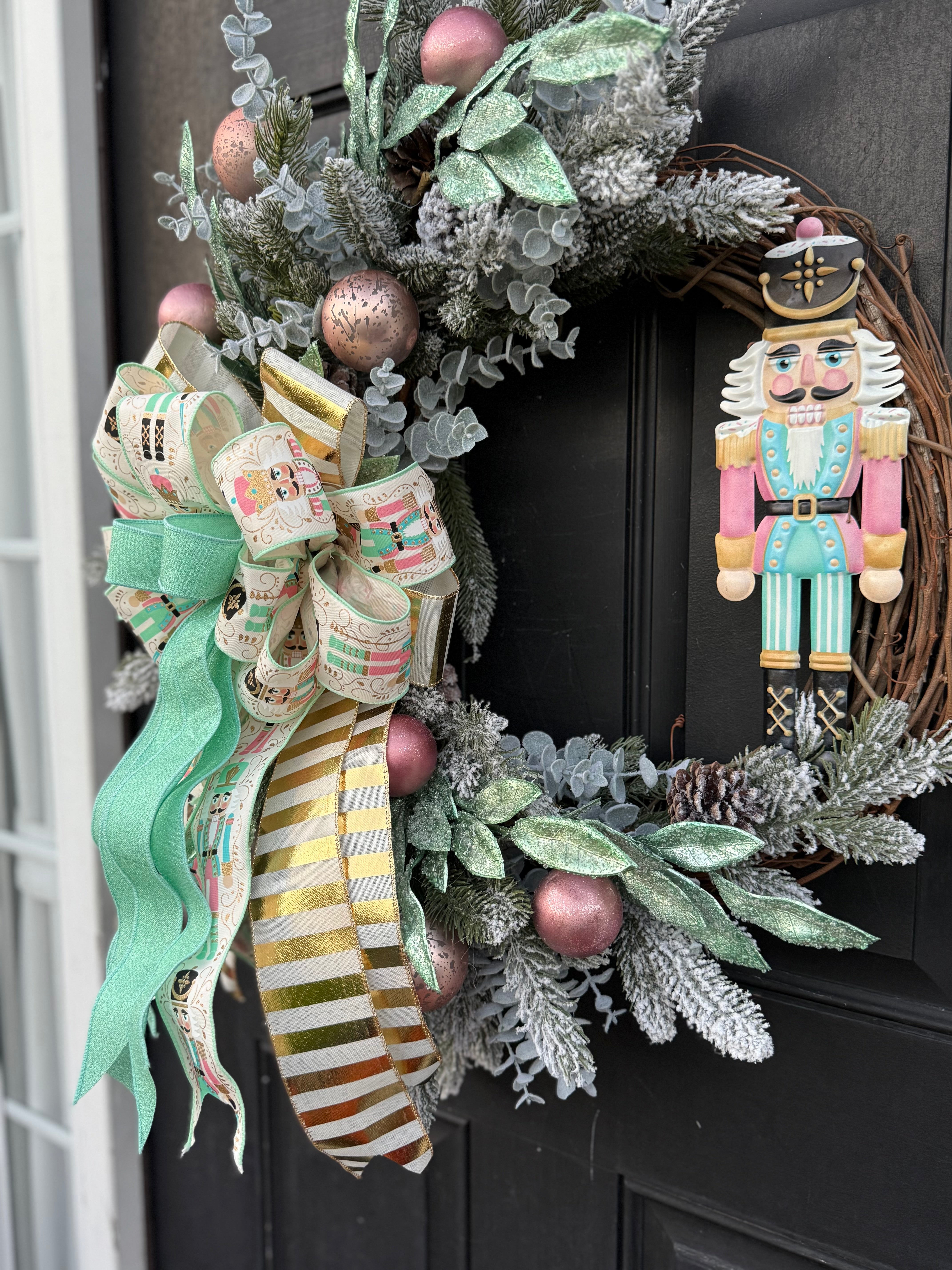 Bring a touch of Nutcracker magic to your home this holiday season with this handcrafted pastel Christmas wreath! Perfect for lovers of soft, elegant holiday décor, this wreath combines frosted evergreens, sparkling pink ornaments, and shimmering mint leaves — all accented by a large Nutcracker-themed bow and matching metal Nutcracker figure.